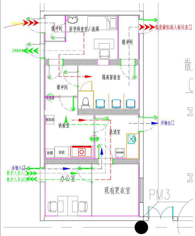 (3) 污染區(qū):快檢室、洗消室、醫(yī)學(xué)排查室/流調(diào)、隔離留驗(yàn)室。
