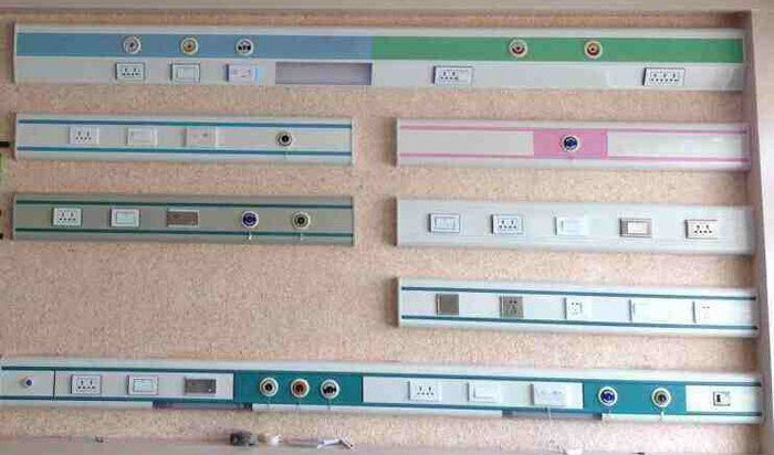 設備帶固定在病房床頭上方的墻壁上,用來安裝電源插座、呼叫按鈕、電源開關、中心供氧及負壓吸引等系統(tǒng)的氣體閥等設備,另外也可固定其它一些醫(yī)療設備,如輸液裝置、其它報警裝置等。