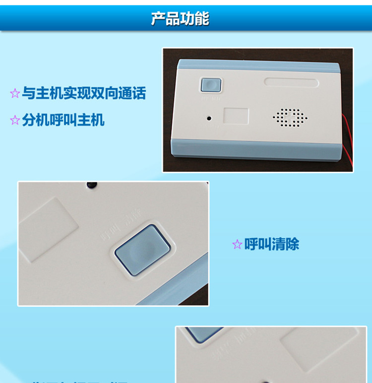 分機由兩部分組成:面板與手柄線組成。面板上有“呼叫/取消按鈕”及喇叭,手柄線有受話咪頭與按鈕。從護士站過來的聲音由面板上喇叭傳出。病人可以在床上按手柄線上的按鈕呼叫或面板上的“呼叫/取消”按鈕呼叫,服務(wù)人員到床前服務(wù)后可以按面板上的呼叫按鈕再取消呼叫。