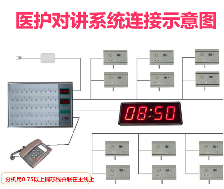 線路鋪設(shè):自主機放置位置開始鋪設(shè)一根兩芯線,順延(或連接)至走廊最遠的房間門前,每個房間并聯(lián)一根兩芯線至各個病床床頭(或自供氧設(shè)備鋁帶中穿行);請勿將總線與其它供電線路并行,以免影響通話質(zhì)量;線路鋪設(shè)完畢后,請用萬用表檢測線路電阻,確保線路無短路現(xiàn)象。